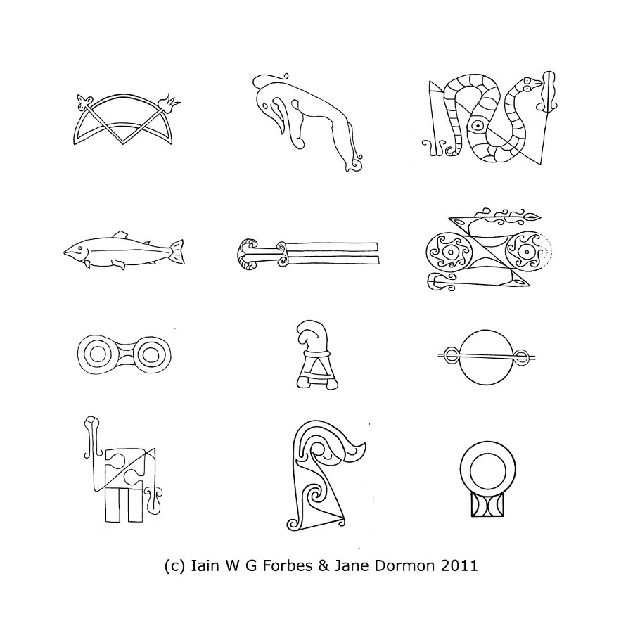 The ‘mirror’ and ‘comb’ symbols do not seem to be mainstream symbols but appear to be supplementary to the other symbols. They are usually smaller than the principal symbols, and appear typically below the main pairing. The mirror can appear on its own or with the comb, but there is no clear example of the comb appearing by itself, suggesting some form of logical coding or stratification. It may be that these two symbols were intended to convey additional information to the viewer about the combination of the mainstream symbol pairs; they therefore may act as ‘qualifiers’, providing further clarity to the message. An example of a stone bearing a mirror and comb alongside a symbol pair can be found in the picture of the Aberlemno 1 stone (bottom right of stone).